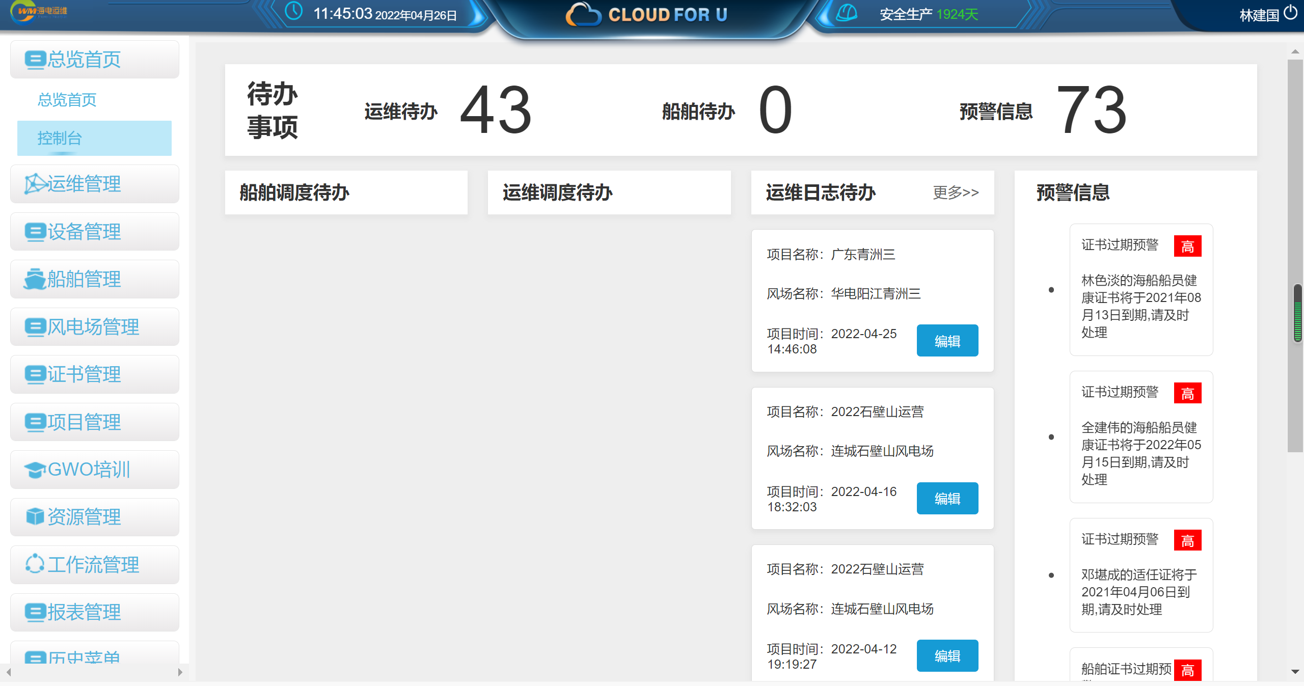 该系统是为 福建海电运维科技有限责任公司 打造的 公司内部流程管控系统,可以帮助该公司 对运维工单、船舶工单以及公司项目立项到完成的全流程管控。
