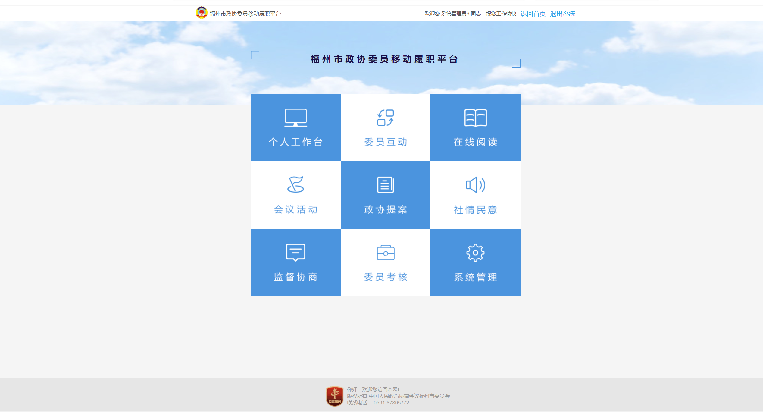 该系统是为福州市政协打造的办公OA系统,主要为了政协委员可以在线上办公,进行提案和社情民意的一系列流程,并可以通过统计分析委员的履职数据,从而可以让工作人员更了解各委员的履职情况。
